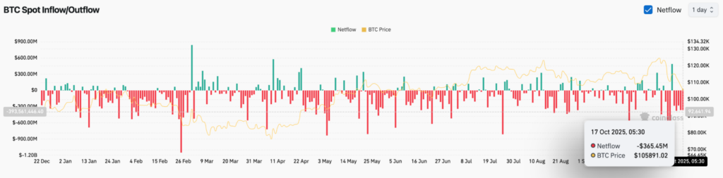 Data from Coinglass shows that Bitcoin recorded more than $1.66 billion in cumulative outflows over the past five sessions, including $365 million on Oct. 17 alone.