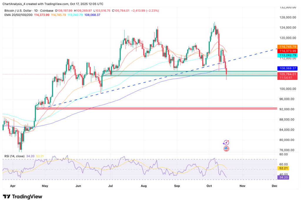 Technical analysis: Bitcoin’s daily chart confirms a breakdown below $108,000, where the 200-day exponential moving average (EMA) had previously acted as strong support.
